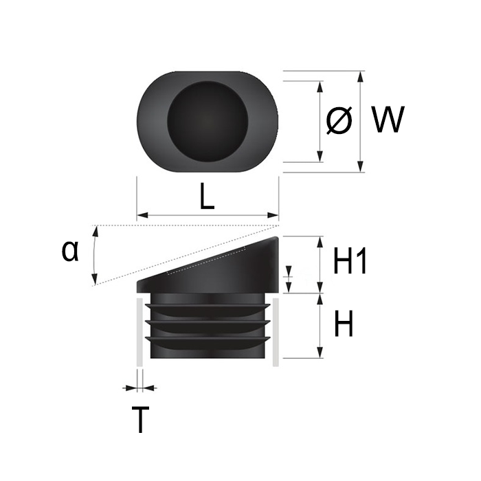 PE body with flexible internal walls. 15° angle correction. Built-in pad slot with replaceable PA6 insert. Angled oval tube plugs with pad slot are angled oval plugs floor protection for splayed oval furniture legs on hard floors. One size: 25 × 35 mm with 1.5 to 2.5 mm wall thickness. Black and grey. Sold in multiples of 4.