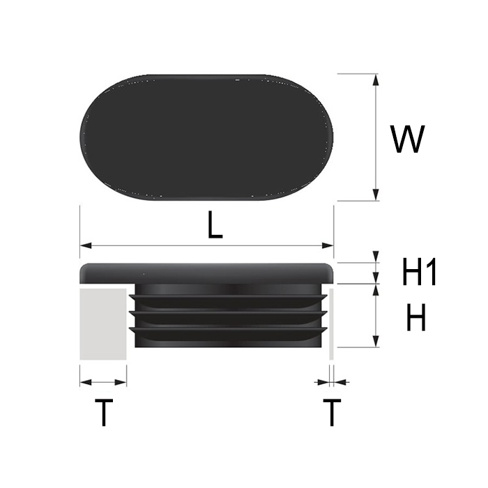 Same PE construction, same flat head, same oval cross-section as standard oval tube plugs. The only difference is the body length. Extended oval tube plugs are deep insertion oval plugs for 15 × 30 mm thin-walled oval tubing where standard depth is not enough. Black and white. Sold in multiples of 4.