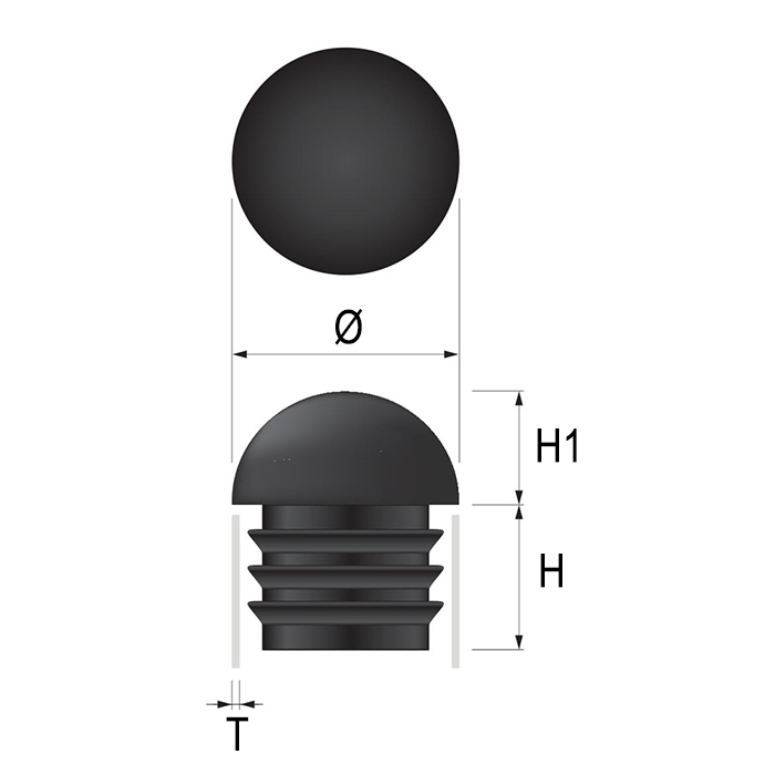 Same PE construction and flexible ribbed body as the flat head range. Same press-fit installation. The only difference is the head: a full hemisphere instead of a flat disc. Half-sphere head round tube plugs are hemisphere decorative tube plugs for furniture where maximum visual impact on exposed tube ends is the goal. 5 sizes from Ø 16 mm to Ø 30 mm. Wall thickness 1 to 1.5 mm (Ø 16 also available in 1.5 to 2 mm). Black, grey, and white. Sold in multiples of 4.