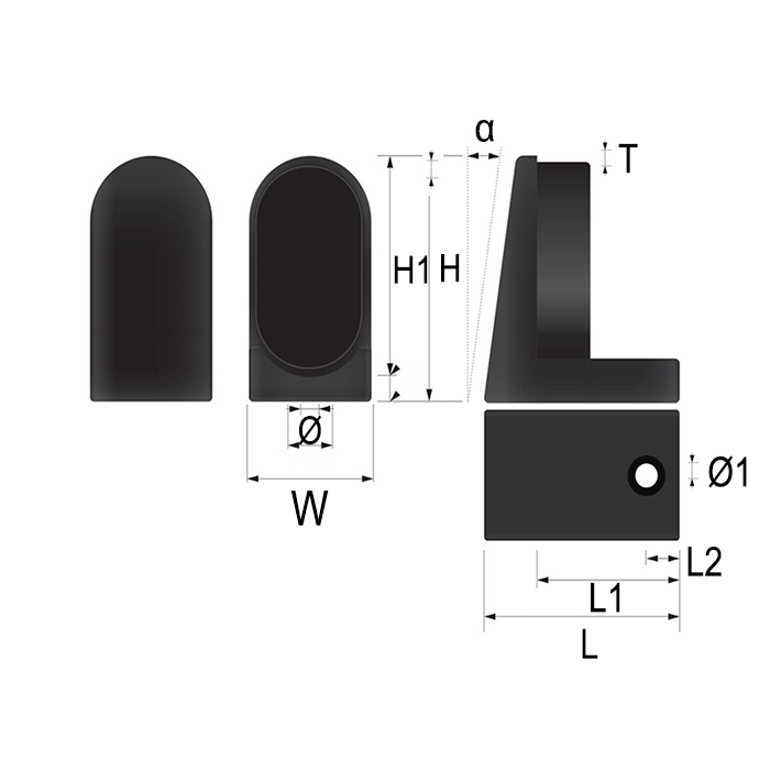 Oval tube end sled base glides cap the open end of oval tube sled runners in three sizes: 20 × 30, 25 × 35, and 30 × 50 mm. Each slides over the oval tube end and is secured with one screw. Angled design (11° to 18°) matches the runner’s floor-contact angle. Flat PA floor contact. Grey. Tube wall 1.5 to 2 mm. Sold individually.