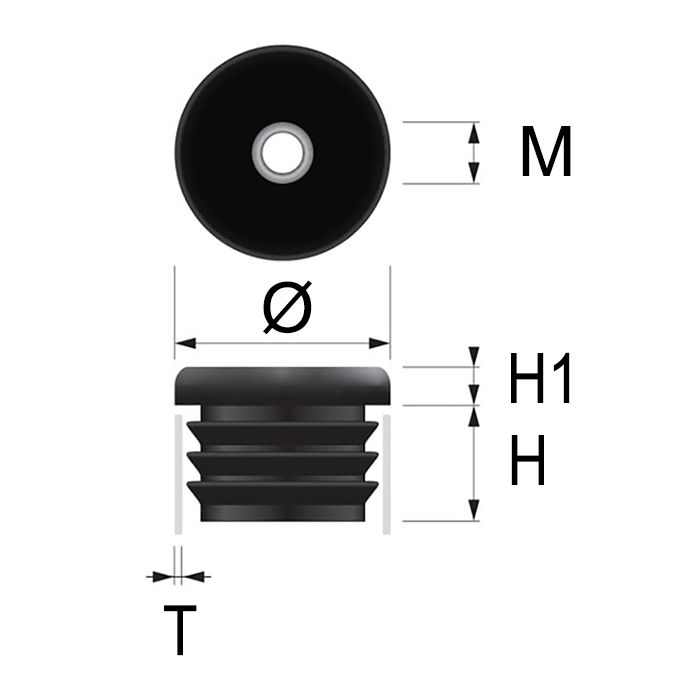 Round threaded inserts press inside hollow round furniture legs and provide a built-in threaded nut for adjustable leveling feet. The PA body grips the tube interior with flexible ribs. The zinc-plated steel nut accepts M6, M8, M10, or M12 leveling feet. Match the insert to the tube diameter and wall thickness, then screw in any leveling foot with the corresponding thread. Threaded inserts for round tube legs on tables, desks, workbenches, and commercial furniture that needs height adjustment. 3 diameters: Ø 28, 40, and 50 mm. Wall 1 to 2 mm. Black, grey, and white. Sold in multiples of 4.