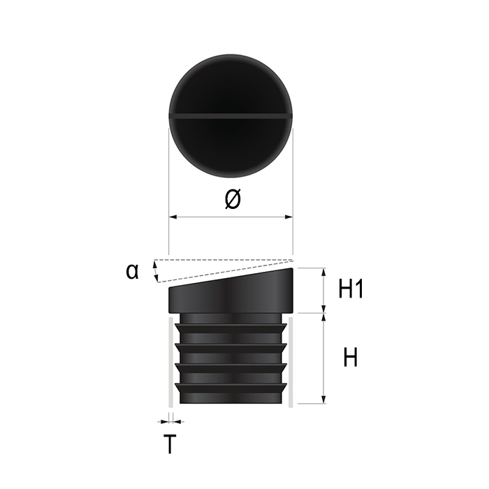 Angled round tube plugs compensate for splayed or tilted furniture legs so the plug base sits flat on the floor. Press-fit ribbed walls hold securely inside hollow tubes. Ø 20 mm and Ø 22 mm sizes. Wall thickness 1.5–2.5 mm. Black and grey. Polyethylene (PE) construction. For chairs, stools, and frames where legs meet the floor at an angle.