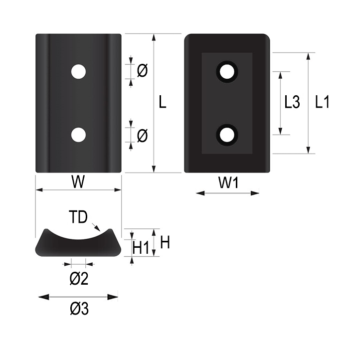 Tube Diameter (Ø2) Base Dimensions (L x W) Slot Dimensions (L1 x W2) Hole Center (L2) L3 (Center Between Holes) Hole Diameter (Ø) Hole Diameter (Ø1) Total Height (H) Base Height (H1)