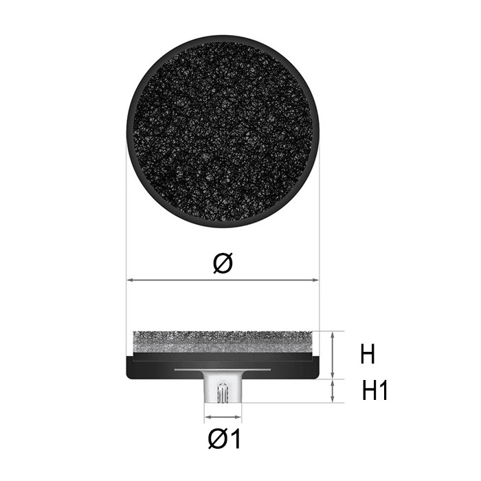 PA6 needle-punched surface, ABS platform, ZnFe steel tubular rivet, EHBF adhesive backing (50 × 50 mm and 75 × 75 mm sizes only) |
